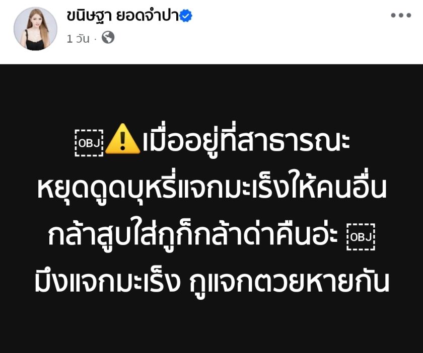 ข้อความที่สาวเบลล์โพสต์นั้นมาพร้อมกับความดุดันและตรงไปตรงมาขั้นสุด โดยระบุใจความว่า “เมื่ออยู่ที่สาธารณะ หยุดดูดบุหรี่แจกมะเร็งให้คนอื่น กล้าสูบใส่กูก็กล้าด่าคืนอ่ะ มึงแจกมะเร็ง กูแจกตวยหายกัน” ซึ่งประโยคดังกล่าวสะท้อนให้เห็นถึงความอึดอัดและสุดจะทนกับสถานการณ์ที่ต้องเผชิญกับควันบุหรี่มือสองที่ตนเองไม่ได้เป็นผู้ก่อ แต่กลับต้องมารับความเสี่ยงในการเป็นโรคร้ายอย่างมะเร็งแทน