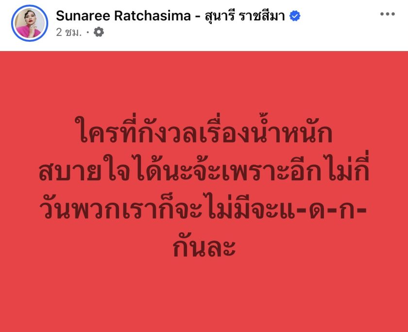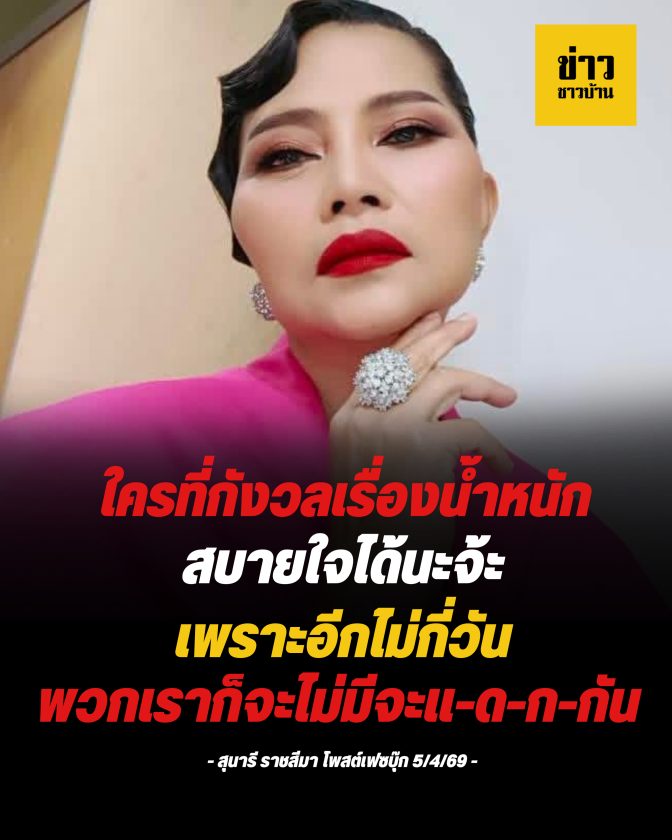 กลายเป็นไวรัลสนั่นโซเชียล เมื่อราชินีลูกทุ่งเสียงดี “สุนารี ราชสีมา” ออกมาโพสต์ข้อความผ่านเฟซบุ๊กส่วนตัว (5 เม.ย. 69) สะท้อนภาพรวมเศรษฐกิจและค่าครองชีพ โดบระบุว่า “สุนารีราชสีมา ออกมาโพสต์ ใครที่กังวลเรื่องน้ำหนักสบายใจได้นะจ้ะเพราะอีกไม่กี่วันพวกเราก็จะไม่มีจะแ-ด-ก-กันละ