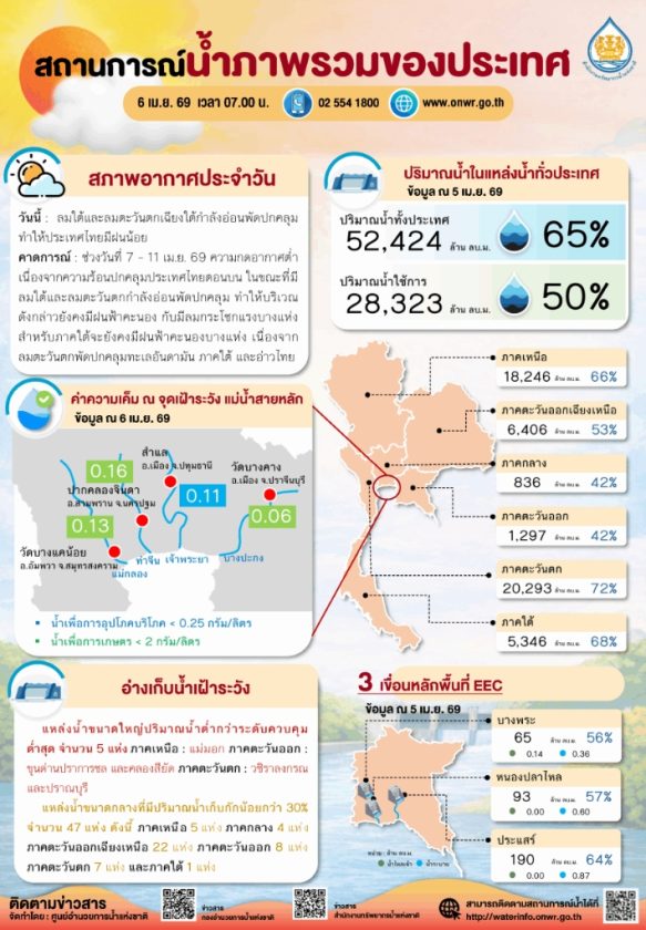วันที่ 6 เมษายน 2569 สำนักงานทรัพยากรน้ำแห่งชาติ (สทนช.) รายงานสถานการณ์น้ำทั่วประเทศ ณ เวลา 07.00 น. พบว่าปริมาณน้ำในอ่างเก็บน้ำรวมอยู่ที่ 65% ของความจุ หรือประมาณ 52,424 ล้านลูกบาศก์เมตร ขณะที่ปริมาณน้ำที่สามารถนำมาใช้ได้จริงอยู่ที่เพียง 50% หรือราว 28,323 ล้านลูกบาศก์เมตร