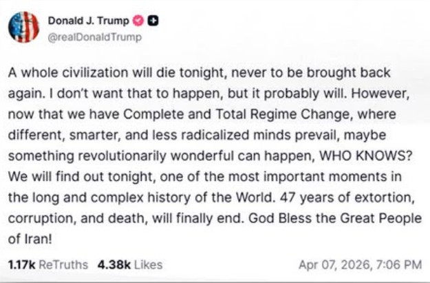 กลายเป็นกระแสวิพากษ์วิจารณ์อย่างหนักในโลกออนไลน์ หลัง Donald Trump อดีตประธานาธิบดีสหรัฐอเมริกา โพสต์ข้อความผ่านแพลตฟอร์ม Truth Social โดยมีเนื้อหาบางช่วงระบุว่า “อารยธรรมทั้งมวลจะล่มสลายในคืนนี้ และจะไม่สามารถนำกลับมาได้อีก”