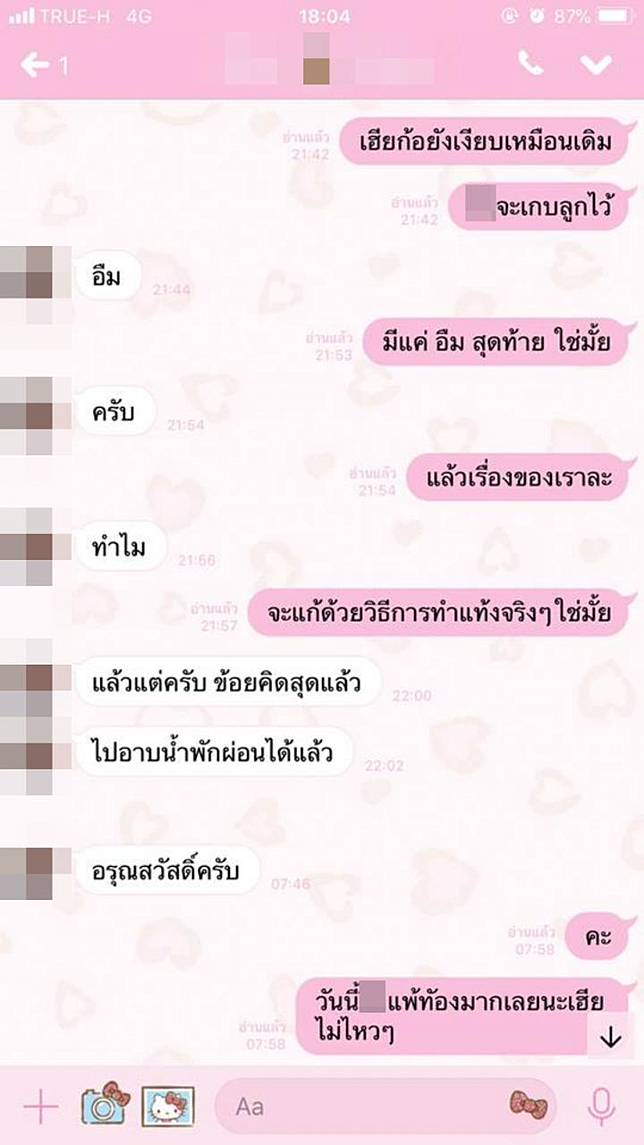 จนกระทั่งวันที่ 28 พ.ย.60 ตนได้ตั้งท้องกับผู้ชายคนนี้ แต่อีกฝ่ายกลับหนีปัญหา พูดเพียงว่าให้ไปเอาเด็กออก และได้ออกอุบายบอกกับตนว่าจะพาฝากท้อง แต่ที่จริงแล้วกลับพาไปทำแท้ง โชคดีที่ตนรู้ตัวก่อนจึงไม่ได้เอาเด็กออก และตั้งแต่วันนี้ผู้ชายคนนี้ก็พยายามบ่ายเบี่ยง ไม่แสดงความรับผิดชอบใดๆ ทั้งสิ้น รวมทั้งไปบอกกับคนอื่นว่า “ไม่ได้ทำเราท้อง”